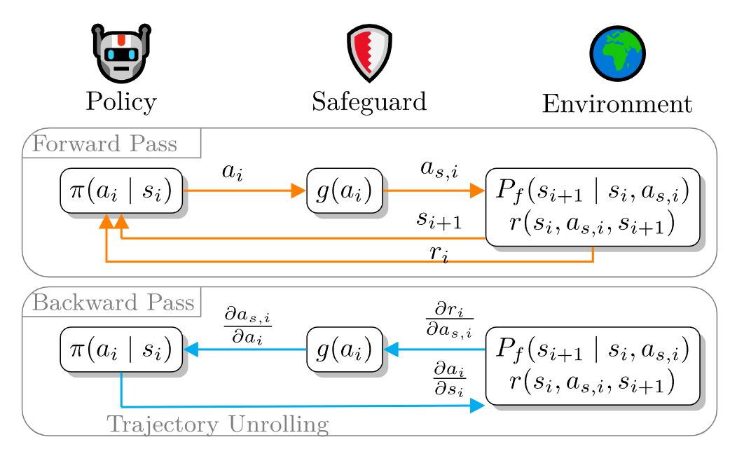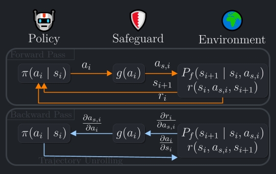 With SafeGBPO we developed the first effective safeguard for analytic gradient-based reinforcement learning. We analysed existing, differentiable safeguards, adapted them through modified mappings and gradient formulations, and integrated them into a state-of-the-art learning algorithm and a differentiable simulation.